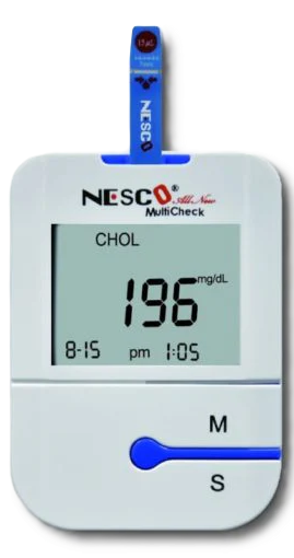 Tests for Total Cholesterol, Uric Acid, and Glucose using single strip tests. Professional standard device with self-testing diagnostics and control solutions for accuracy.